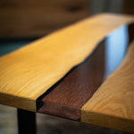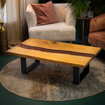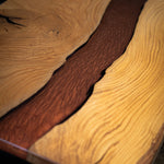 Dieser aus Eichenholz gefertigte Couchtisch wird mit einer Kombination aus Bronze-Harz und transparentem Harz veredelt. Das Harz ist poliert, das Holz geölt, sodass die natürliche Maserung des Holzes und das elegante Farbspiel der Harze besonders zur Geltung kommen. Ein einzigartiges Unikat, das jedem Wohnzimmer Stil und Charakter verleiht.