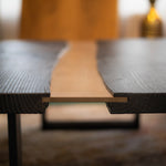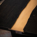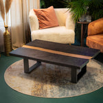 Dieser Couchtisch wurde schwarz gekohlt und matt lackiert. Abgerundet wird das Design durch eine eingelegte Bronze-Optik-Platte, die ein einzigartiges Farb- und Strukturerlebnis schafft. Ein stilvolles Unikat, das jedem Raum Charakter und modernen Industrial-Charme verleiht.