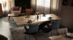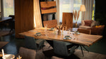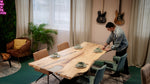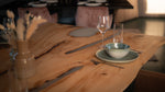 Massive Kastanienplatte mit lebendiger, wilder Maserung und edlen Kontrasten. Der natürliche Riss ist mit weißem Epoxidharz ausgegossen, wodurch Struktur und Form besonders betont werden. Ein Unikat mit Charakter.